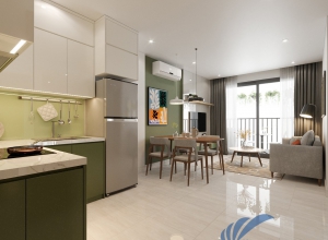 Căn bếp được  thiết kế nội thất chung cư 75m2 với tinh thần “hơi thở Bắc Âu” – tinh gọn, sạch sẽ, sáng sủa. Tủ bếp thiết kế full trần với tay nắm ẩn tạo cảm giác liền mạch, hiện đại. Thiết bị âm tường (máy hút mùi, lò nướng, bếp điện từ) đồng bộ hóa về màu sắc và kiểu dáng giúp không gian như một khối thống nhất.